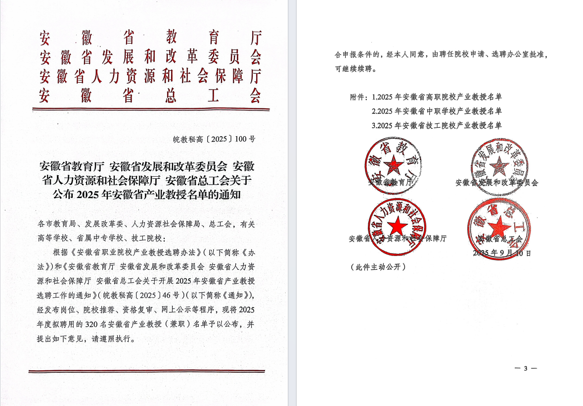 根據(jù)《安徽省教育廳 安徽省發(fā)展和改革委員會 安徽省人力資源和社會保障廳 安徽省總工會關(guān)于公布2025年安徽省產(chǎn)業(yè)教授名單的通知》(皖教秘高〔2025...